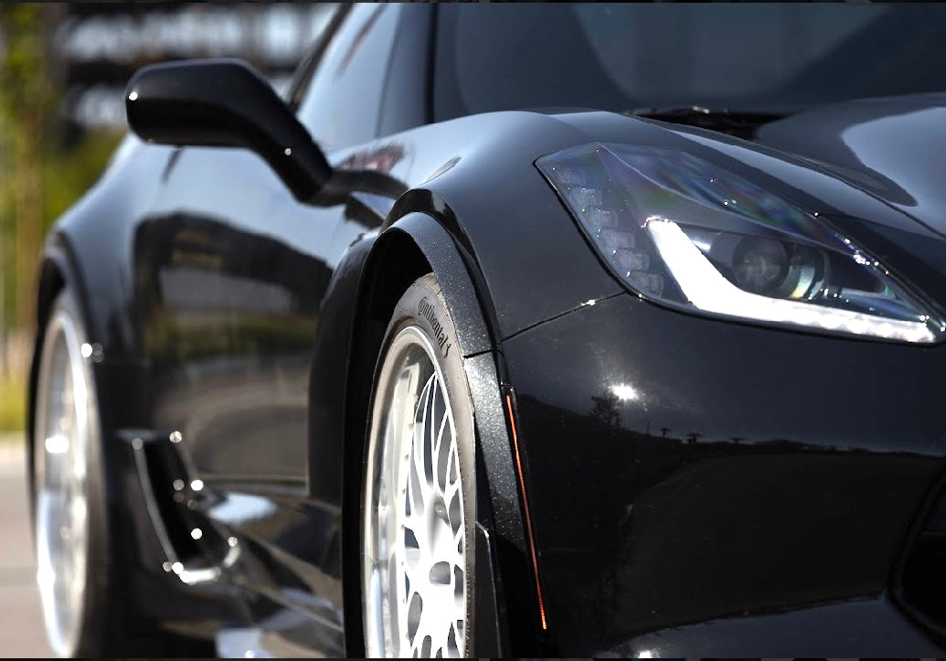ACS XL Rock Guards in Carbon Flash Metallic Black, Stage 3 Front Splitter, C7 Carbon Rear Diffuser,